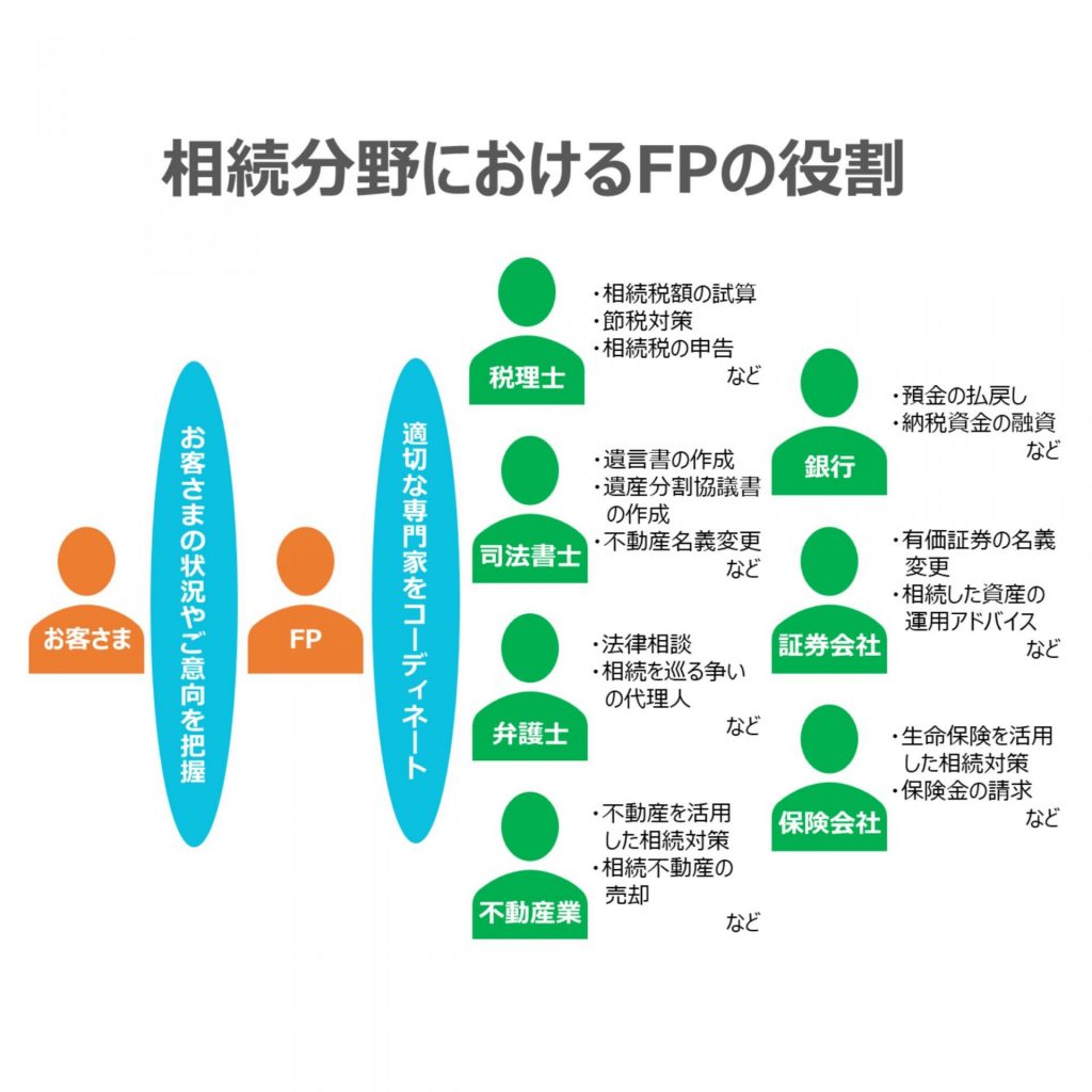 FPは全体を俯瞰し、必要に応じて税理士・弁護士・司法書士や金融機関と連携しながら、あなたにとって最適な選択肢をご提示できます。言わば、FPが相続の窓口の役割を果たし、あなたに伴走しながら、幅広く、奥深い相続分野の問題解決をサポートします。